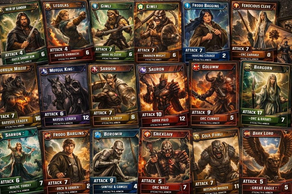 El Señor de los Anillos es un universo perfecto en este formato porque su mundo está lleno de elementos fácilmente transformables en cartas. De este modo, personajes como Aragorn, Gandalf, Sauron, Gollum o Legolas pueden convertirse en unidades con habilidades únicas, mientras que objetos como Andúril, las lembas élficas o el Anillo Único funcionan como cartas complementarias. También existen facciones muy claras, visibles en el mundo de Tolkien, como Gondor, Rohan, los elfos, los orcos, los Nazgûl o los hombres del este. Esto permite crear mazos con identidad, donde la narrativa se mezcla con la estrategia de manera natural.